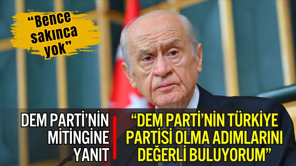 DEM Parti’nin Türkiye partisi olma yönünde attığı adımları olumlu karşıladığını dile getiren Bahçeli, partinin beklenti ve taleplerini demokratik zeminlerde dile getirmesinin doğal olduğunu ifade etti. “Toplansınlar, taleplerini açıklasınlar, buna diyeceğim bir şey olmaz” diyen Bahçeli, olağan bir gelişmeye olağanüstü anlamlar yüklenmemesi gerektiğini vurguladı.