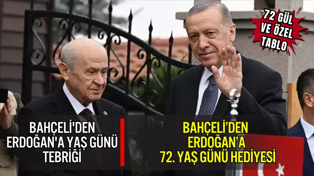 MHP Genel Başkanı Devlet Bahçeli, Cumhurbaşkanı Recep Tayyip Erdoğan’ın 72. yaş gününü tebrik etti. MHP’den yapılan açıklamaya göre Bahçeli, Erdoğan’a 72 gülden oluşan bir çiçek ile özel olarak hazırlanmış bir tablo gönderdi.