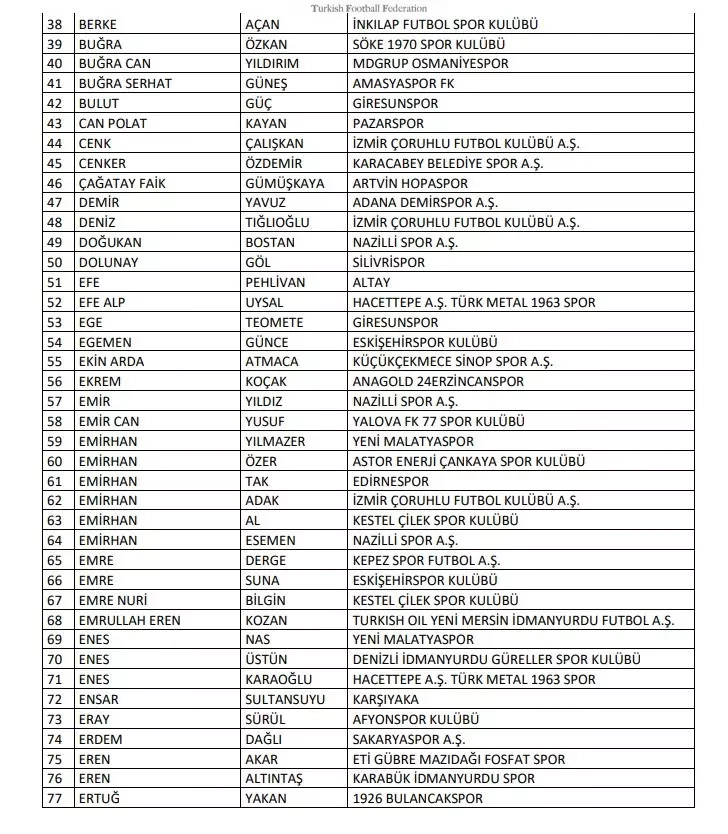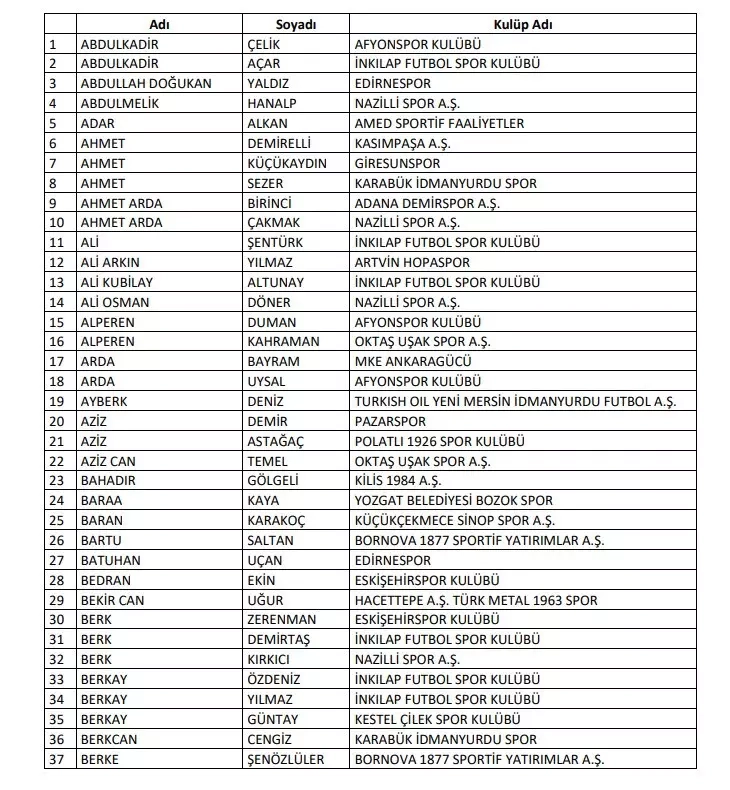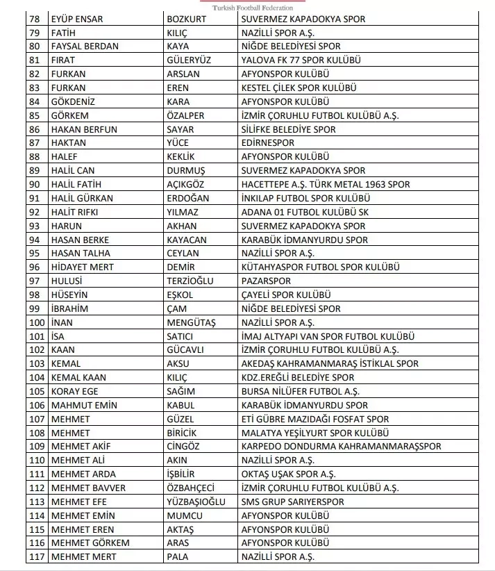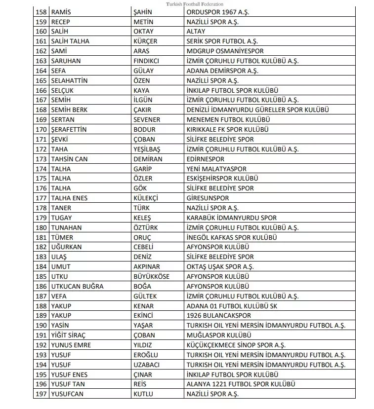 TFF, PFDK’ya sevk edilen 197 futbolcunun isimlerini de kamuoyu ile paylaştı. Açıklanan listeyle birlikte, soruşturmanın kapsamının daha da genişleyebileceği ifade edilirken, disiplin süreçlerinin PFDK tarafından yürütüleceği belirtildi.