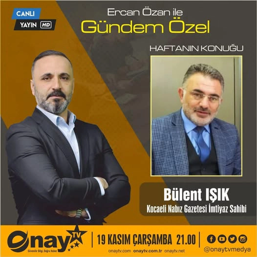 Kocaeli basınının güçlü kalemlerinden, Kocaeli Nabız Gazetesi İmtiyaz Sahibi Bülent Işık, gündeme damga vuran açıklamalarıyla Onay TV ekranlarında izleyiciyle buluşacak.