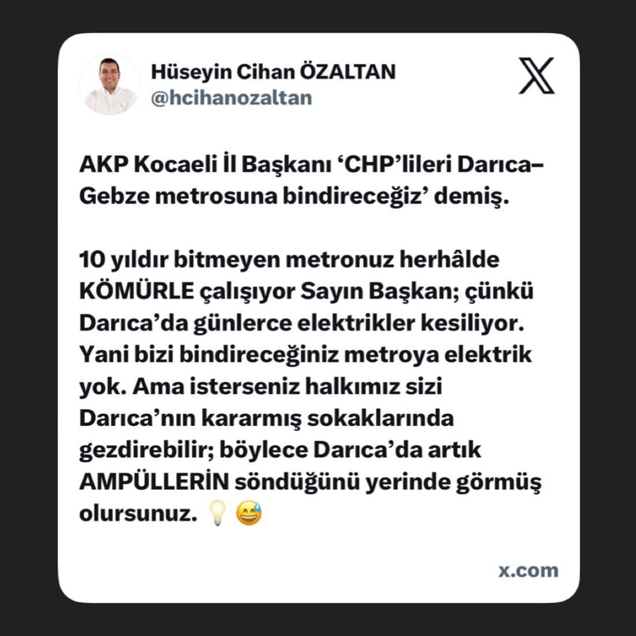 CHP Darıca İlçe Başkanı Hüseyin Cihan Özaltan, AK Parti Kocaeli İl Başkanı’nın “CHP’lileri Darıca–Gebze metrosuna bindireceğiz” sözlerine çok sert ifadelerle yanıt verdi. Özaltan, yıllardır tamamlanamayan metro projesini ve Darıca’daki sık sık yaşanan elektrik kesintilerini hedef alarak AK Parti yönetimini eleştirdi.