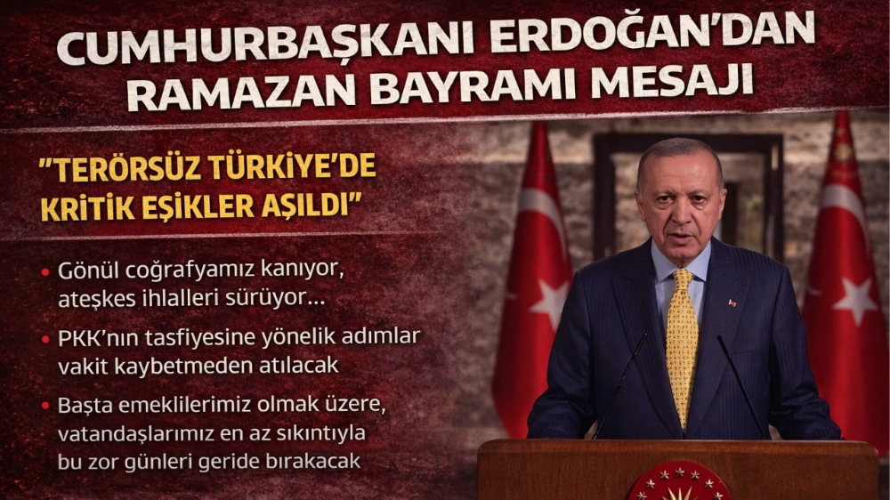 Cumhurbaşkanı Recep Tayyip Erdoğan, Ramazan Bayramı dolayısıyla yayımladığı mesajda, ülkenin güvenlik gündeminden ekonomiye, bölgesel krizlerden sosyal politikalara kadar birçok konuda değerlendirmelerde bulundu. Erdoğan, mesajında vatandaşlara huzurlu bir bayram geçirmeleri temennisinde bulunurken, trafik kurallarına uyulması konusunda da uyarılarda bulundu.