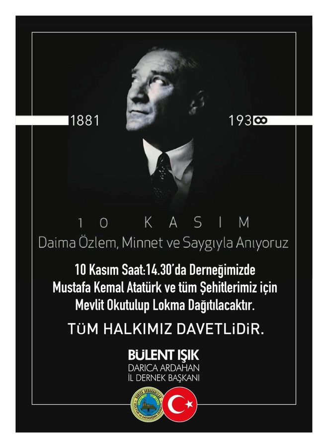Darıca Ardahanlılar Kültür ve Dayanışma Derneği, 10 Kasım Atatürk’ü Anma Günü dolayısıyla anlamlı bir etkinliğe imza atacak. Dernek binasında düzenlenecek programda, ebedi başkomutan Gazi Mustafa Kemal Atatürk ve tüm aziz şehitlerimiz için mevlit okutulacak, ardından lokma ikramında bulunulacak.