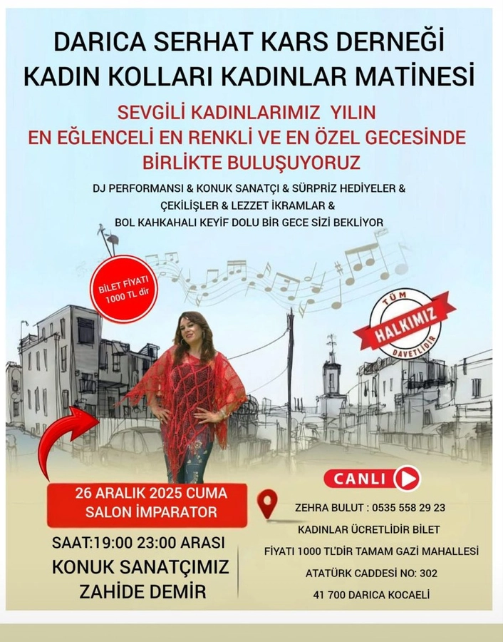 Darıca Serhat Kars Derneği Kadın Kolları, tüm kadınları birlik, dayanışma ve neşe dolu bu özel geceye davet etti. Bu renkli buluşmanın, yöre kültürünü yaşatmanın yanı sıra kadınların sosyal dayanışmasını güçlendirmesi bekleniyor.