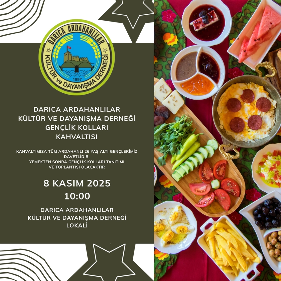 Darıca Ardahanlılar Kültür ve Dayanışma Derneği, gençleri bir araya getirecek özel bir organizasyona hazırlanıyor. Dernek tarafından düzenlenecek gençlik kolları kahvaltısı, 8 Kasım 2025 Cumartesi günü saat 10.00’da dernek lokalinde gerçekleştirilecek.