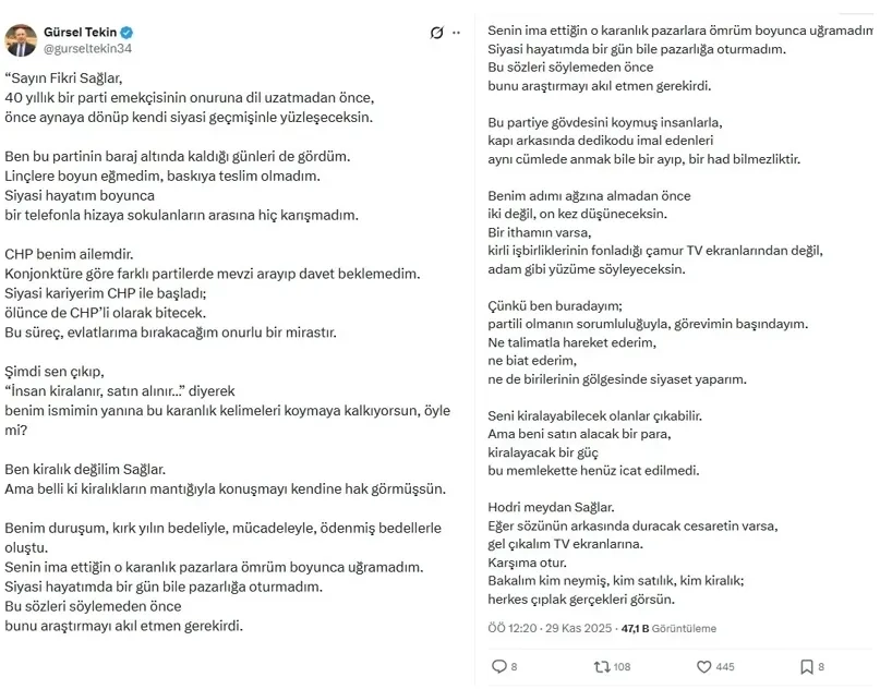 CHP’nin eski milletvekili Fikri Sağlar’ın Tele2’de katıldığı programda yaptığı açıklamalar parti içinde yeni bir tartışmayı alevlendirdi. Sağlar’ın, “İnsanlar ya parayla ya ideolojiyle yer edinirler… ‘Beni satın alamazsınız’ diye üzerinize yürürler ama kiralayabilirsiniz o kişileri” ifadelerini Gürsel Tekin’e yönelik söylediğinin anlaşılması üzerine Tekin’den sert bir açıklama geldi.