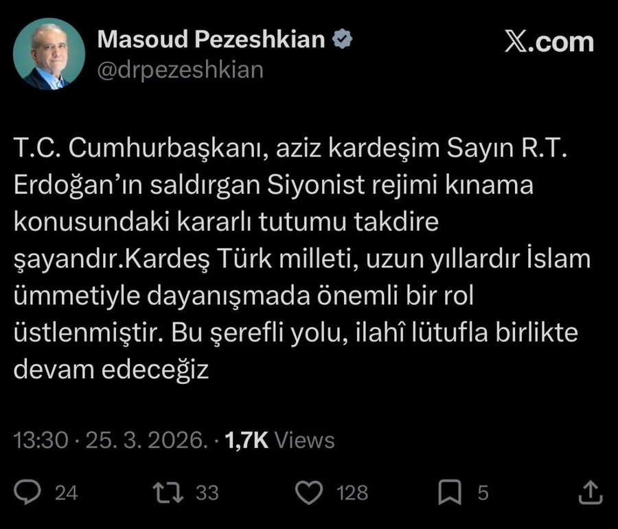 İran Cumhurbaşkanı Mesud Pezeşkiyan, Cumhurbaşkanı Recep Tayyip Erdoğan’a yönelik teşekkür mesajı yayımladı. Sosyal medya hesabından Türkçe paylaşım yapan Pezeşkiyan, Erdoğan’ın İsrail’e yönelik eleştirel tutumunu övdü.