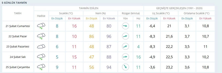 Kocaeli için yapılan tahminlere göre ise yağışlı hava günlerce etkisini sürdürecek. Kentte sıcaklıkların düşmesiyle birlikte hafta boyunca aralıklarla sağanak yağış beklenirken, yüksek kesimlerde yer yer sulu kar görülebileceği bildirildi.