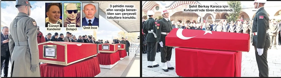 Ancak Türkiye’nin bir araya geldiği bu büyük acıda beklenmedik bir ayrıntı dikkat çekti. Devlet erkanının katıldığı Ankara’daki törende üç şehidin tabutları, altın varağı andıran sarı şeritlerle ve yine altın çerçeveli isim levhalarıyla getirildi. Diğer illerde düzenlenen törenlerde ise şehitlerimiz her zamanki gibi Türk bayrağına sarılı standart protokol tabutlarıyla uğurlandı; isimleri sade beyaz kâğıtla yazıldı.