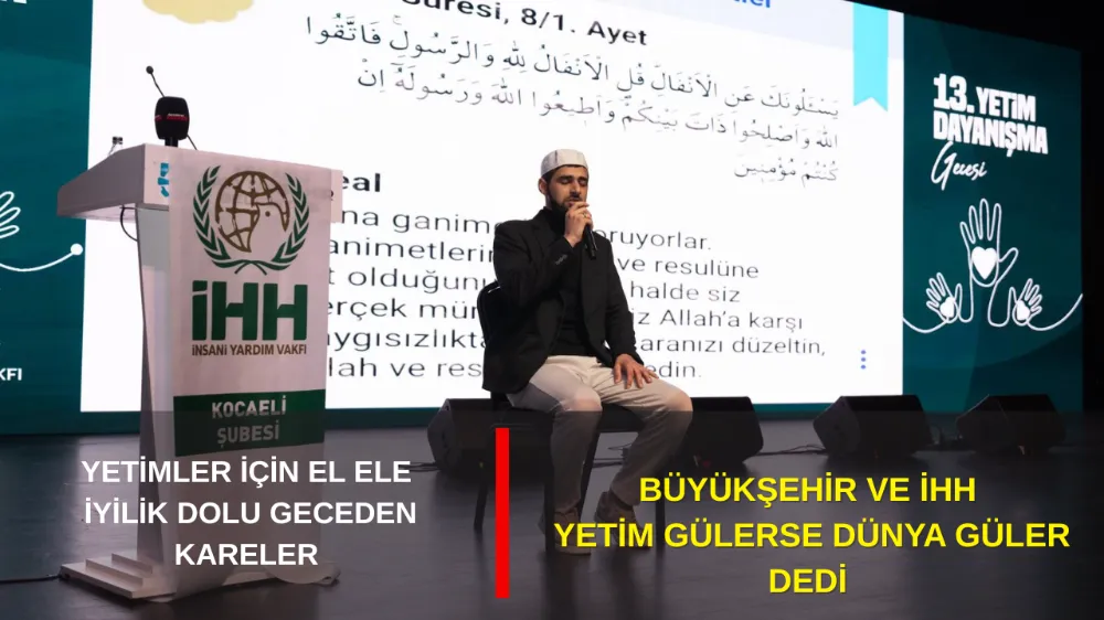 Kocaeli Büyükşehir Belediyesi ve İnsani Yardım Vakfı(İHH) Kocaeli Şubesi öncülüğünde düzenlenen 13. İHH Yetim Gecesi gerçekleştirildi. Kocaeli Kongre Merkezi’nde, “Yetim Gülerse Dünya Güler” sloganı ile organize edilen programa Kocaeli Valisi İlhami Aktaş, Kocaeli Büyükşehir Belediye Başkanı Tahir Büyükakın, AK Parti İl Başkanı Dr. Şahin Talus, İHH Kocaeli Şube Başkanı İsmail Yeşildal, genel merkez yöneticileri, sivil toplum kuruluşlarının temsilcileri ve çok sayıda hayırsever katıldı.