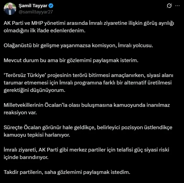 Süreç devam ederken, AK Parti’den Şamil Tayyar, sosyal medya hesabından dikkat çeken uyarılar ve öneriler paylaştı. Tayyar, İmralı ziyaretinin AK Parti gibi merkez partiler için telafisi güç siyasi riskler barındırdığını belirtti ve “Terörsüz Türkiye” projesinin amacına ulaşırken siyasi alanı zedelememesi için farklı bir alternatif üretilmesi gerektiğini ifade etti.
