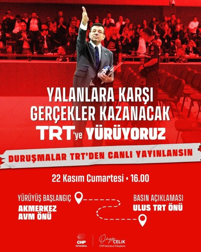 CHP İstanbul İl Başkanı Özgür Çelik, Cumartesi günü saat 16.00’da Akmerkez AVM önünden Ulus’taki TRT stüdyolarına yürüneceğini duyurdu. Çelik, açıklamasında şu ifadeleri kullandı: