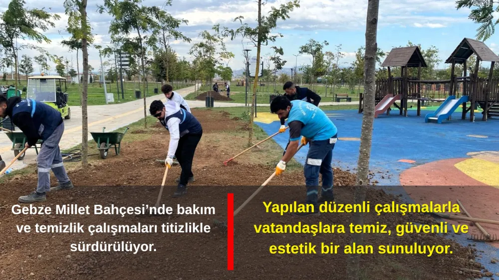 Tüm bu çalışmaların yanı sıra genel çevre temizliği de düzenli olarak gerçekleştiriliyor. Böylece Gebze Millet Bahçesi, vatandaşların yılın her döneminde keyifle vakit geçirebileceği, temiz ve düzenli bir yaşam alanı olarak öne çıkıyor.Kocaeli Büyükşehir Belediyesi, kent genelindeki millet bahçelerinde bakım ve temizlik çalışmalarını aynı özenle sürdürmeye devam ediyor.