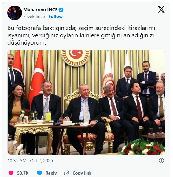 İnce’nin paylaşımı, seçim dönemindeki eleştirilerini ve siyasi tercihlere dair gönderme yapan yorumunu yeniden gündeme taşıdı. Fotoğraf ve İnce’nin açıklaması, sosyal medyada geniş yankı uyandırdı.